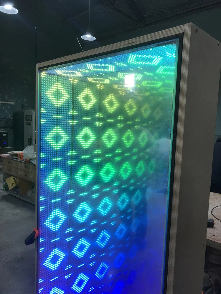 Want to share some of our research into different types of way to integrate digital displays into walls of our projects. We were asked by our clients to see how we can put non traditional displays into our office project. We investigated two avenues: one is a programable digital screen paired with an infinity mirror box that can display dynamic images and video, the other is a led screen placed behind a thin wood veneer that remain imperceptible when off and can be integrated seamlessly into wood paneling or cabinetry.