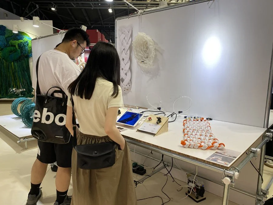 Bill(颜呈勋)受邀参加了融设计图书馆最近的一个关于编织的研究项目,该项目在今年的上海设计博览会上展出。我们是将编织作为一种结构系统,我们探索了气动结构、混凝土浸渍纺织品,并最终痴迷于颗粒堵塞,以赋予编织材料动态结构刚度。我们将发布更多的过程和研究,但首先是一些展览的照片和我们展示的东西:一种连接在真空泵上的颗粒堵塞编织物,人们可以尝试和体验。